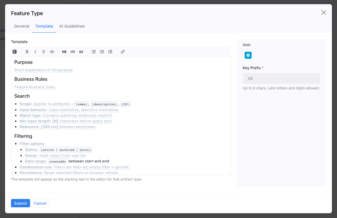 Features are decomposed and organized in a clear tree structure. This helps teams and AI break down complex functionality into smaller, manageable parts. Features are also grouped into modules, which reflect the logical structure of the product. This keeps the repository clean and easy to navigate.