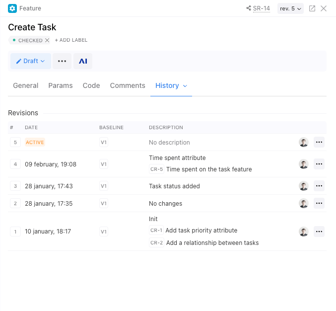 The Traceability Table in the Feature Repository provides a clear visual view of how each feature is connected to other artifacts. You can easily see links between features, data and UI specs, software units, change requests, issues, and test artifacts.