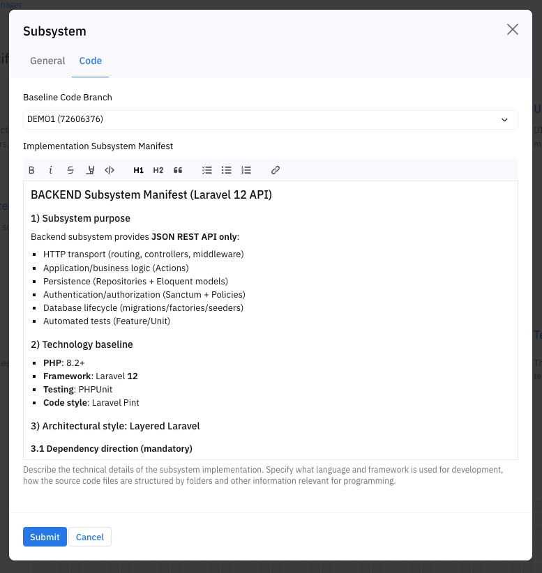 - AI Code Generation Generate implementation code based on subsystem requirements and development manifests.
